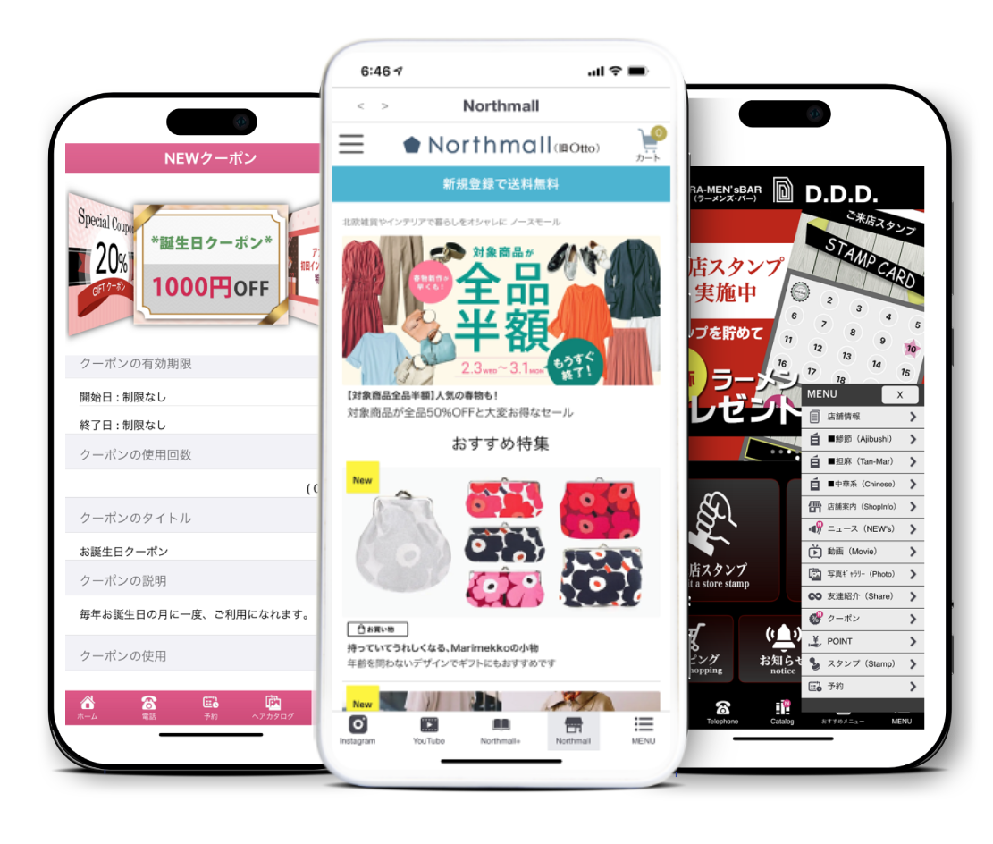 利用料金 ご利用料金 ― Application Price ― アプリ基本機能は全てワンパッケージ ※価格はすべて税別です コース 月額利用料 初期費用 ベーシックコース(基本機能) 19,800円 50万円 スタンダードコース(電子カタログ) 39,800円 100万円 プレミアムコース(多店舗機能) 49,800円 150万円 別途オプション料金 ※価格はすべて税別です 項目 金額 制作代行 10万円~ gpsプッシュ設定 3万円/箇所 チャット機能 30万円 マッチングアプリ開発 お問合せ ※AppStoreデベロッパー費用年間100ドル、GooglePlayデベロッパー登録費25ドル(1回のみ)はお客様が直接、アップル社、グーグル社にカードでお支払いになります。 まずは 無料で 試したい! 30日間の無料体験が可能です!期間終了後も自動課金は一切なし。アカウントは30日後に自動的に削除されます。 お問い合わせ お客様のご要望に合わせて、最適な料金プランをご提案いたします。まずはお気軽にお問い合わせください。 Contact